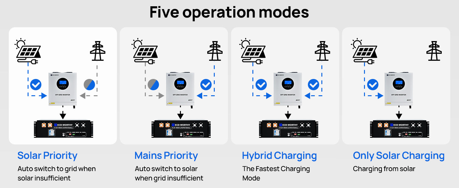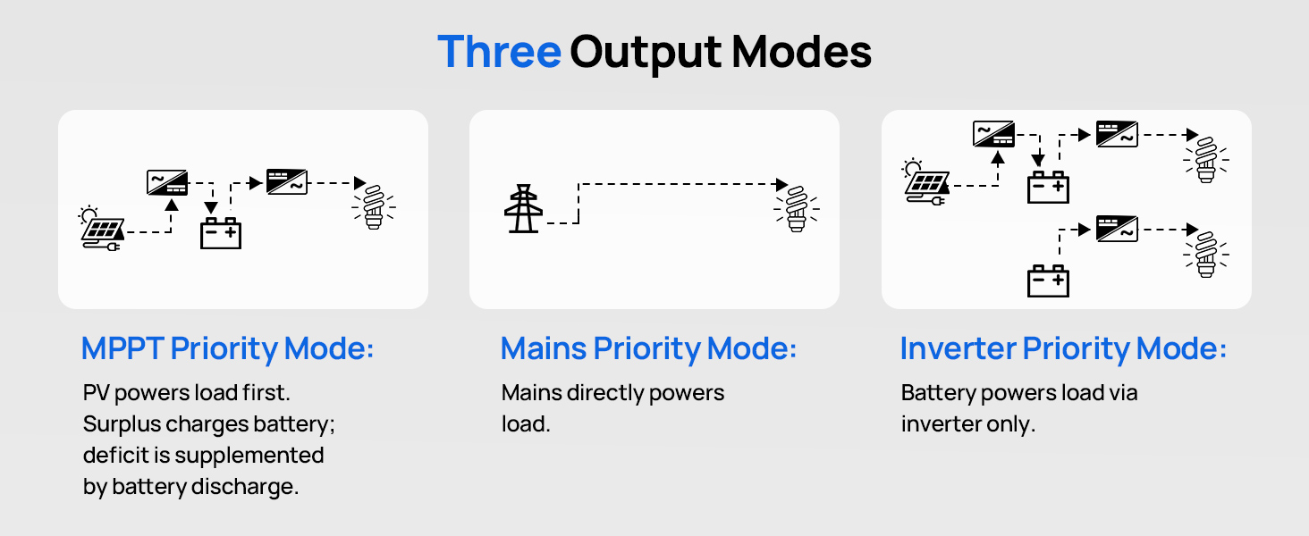 3 output modes: mains priority and, battery priority, PV priority; uninterrupted power supply. Available in 4 charging modes: Only Solar, Mains Priority, Solar Priority and Mains & Solar hybrid charging. Set a flexible time period for mains charging/discharging according to the local mains condition, and help you save the mains.