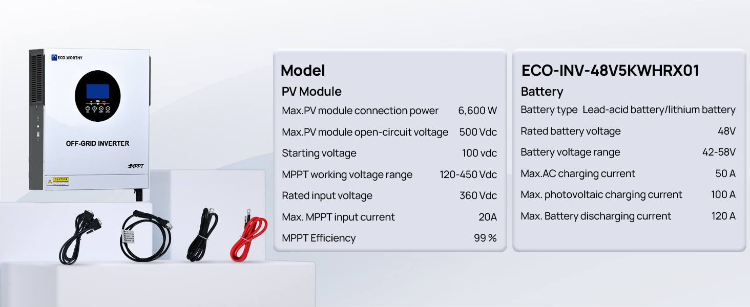 Max.PV input power:6600W, PV input voltage range: 120-450V DC, Max.MPPT Charging Current:20A, Rated Output Power:5000W, Max.Peak Power:10000W, Rated Output Voltage:120/240Vac(split phase)