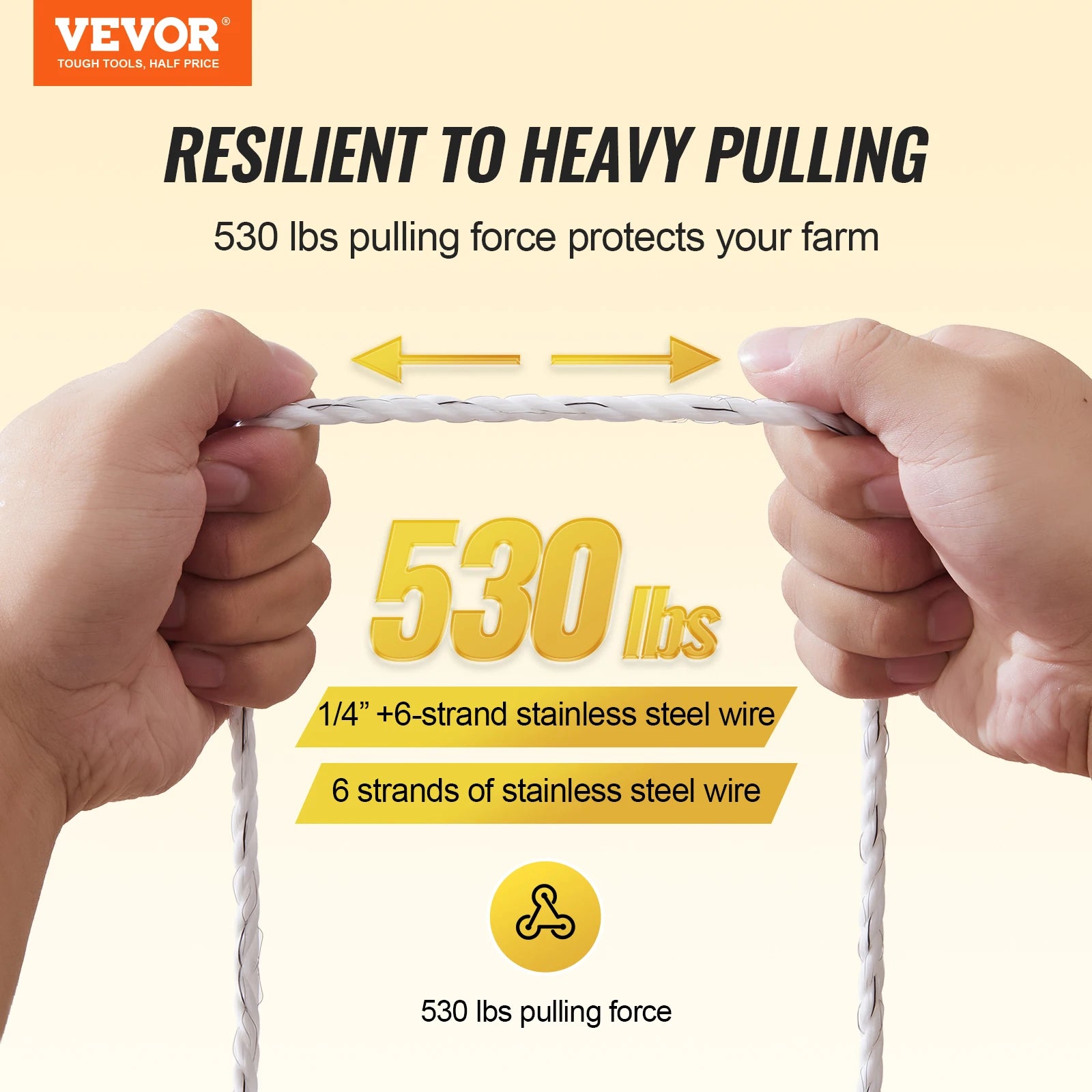 - High Tensile Strength: This electric fence wire has a diameter of 1/4" and comes in a roll length of 656ft/200m, capable of withstanding up to 530 lbs of tension. This high-tensile design ensures stability and safety, making it ideal for temporary pastures and rotational grazing.